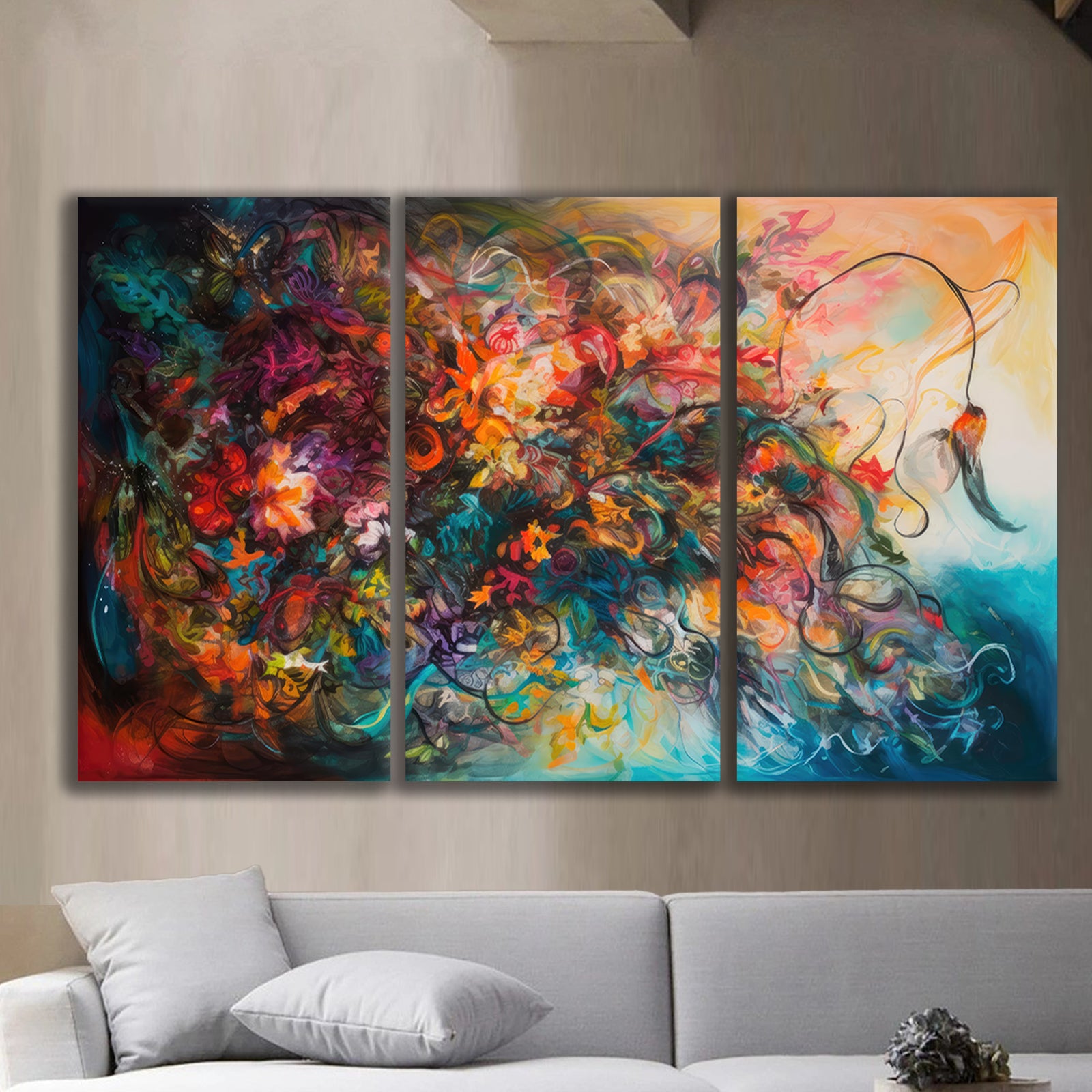 The artwork is printed on high-quality canvas, delivering vibrant, lasting colors and exceptional durability. These unframed and unscreened canvases come in separate pieces, providing the flexibility to display them as individual artworks or as part of a larger, unified composition.